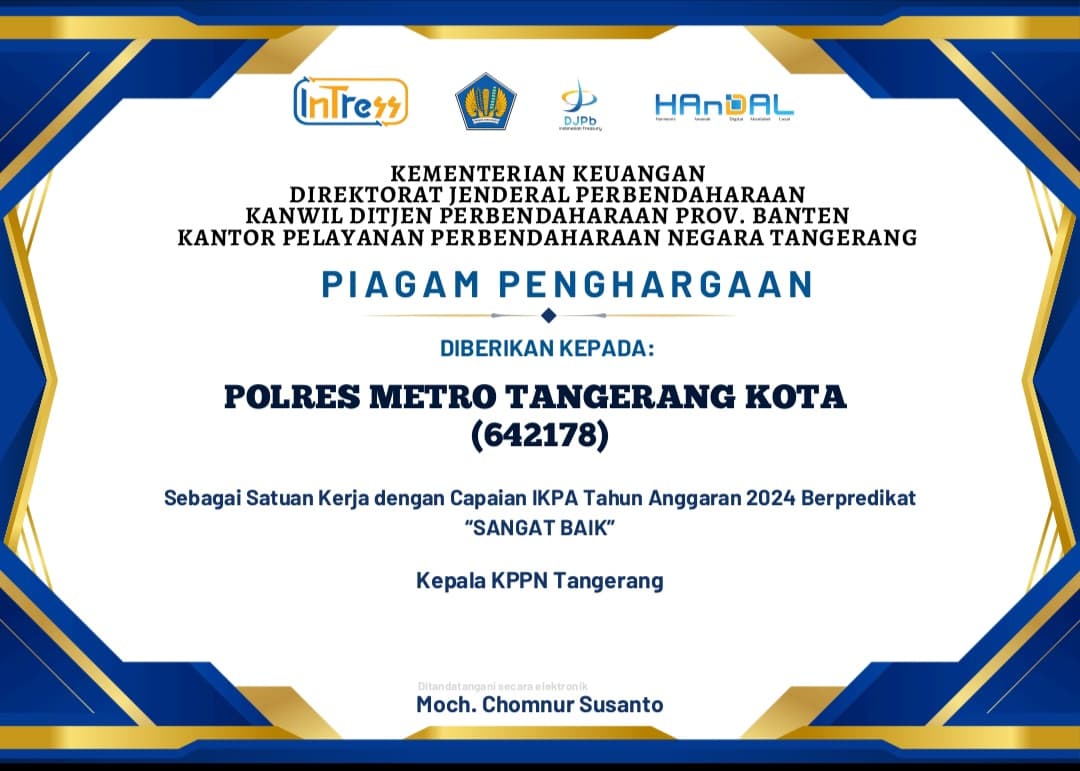 Kedua, Polres Metro Tangerang Kota sebagai Satuan Kerja dengan Capaian Indikator Kinerja Pelaksanaan Anggaran atau IKPA Tahun Anggaran 2024 berpredikat “SANGAT BAIK”.