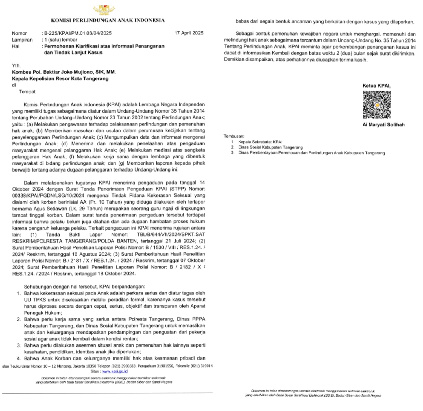 Tangerang — Komisi Perlindungan Anak Indonesia (KPAI) resmi melayangkan surat klarifikasi kepada Kapolres Kota Tangerang, Kombes Pol. Baktiar Joko Mujiono, terkait penanganan kasus dugaan kekerasan seksual terhadap anak yang dilaporkan sejak Oktober 2024 lalu.