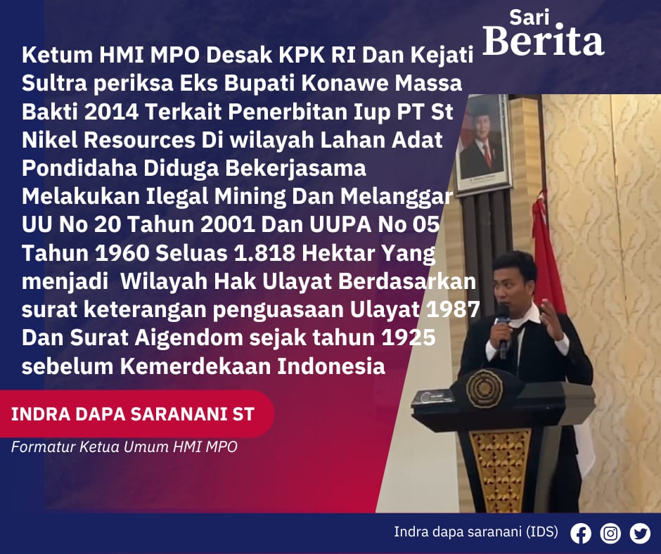Konawe, Sulawesi Tenggara —Himpunan Mahasiswa Islam (HMI MPO) Kabupaten Konawe Selatan mendesak Komisi Pemberantasan Korupsi (KPK) dan Kejaksaan Tinggi Sulawesi Tenggara segera mengusut dugaan penyalahgunaan wewenang dalam proses penerbitan dan kepemilikan Izin Usaha Pertambangan (IUP) oleh PT St Nikel Resources yang diduga terjadi sejak tahun 2014.