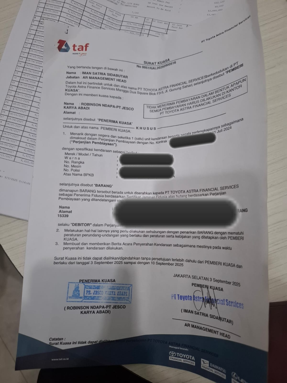 Tangerang – Seorang nasabah Toyota Astra Financial Services (TAF) Finance mengaku resah atas tindakan debt collector dari PT Jesco Karya Abadi yang ditugaskan menagih tunggakan cicilan kendaraannya. (8/9/25)