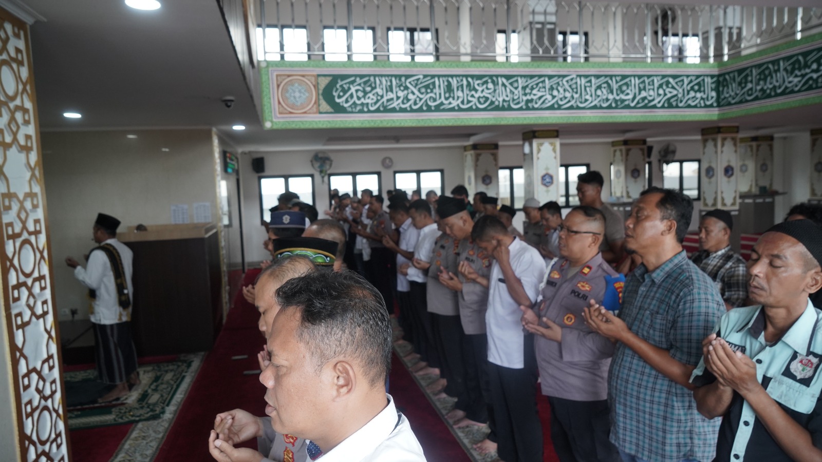 Suasana haru tampak menyelimuti masjid saat jajaran kepolisian, staf, dan para jamaah warga sekitar bersama-sama menundukkan kepala, memanjatkan doa untuk saudara-saudara sebangsa yang sedang dilanda musibah.