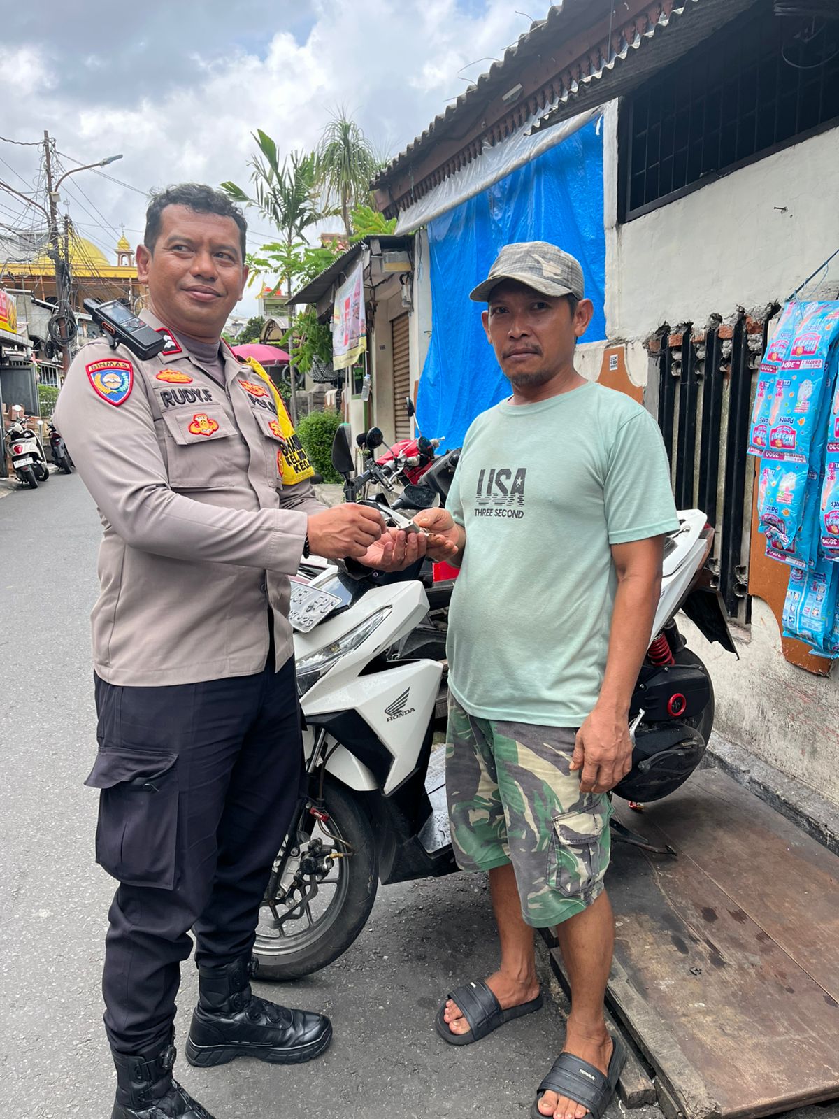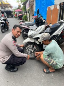 Dalam suasana yang akrab dan humanis, Bhabinkamtibmas memberikan edukasi pentingnya penggunaan kunci ganda dan gembok tambahan pada kendaraan bermotor.